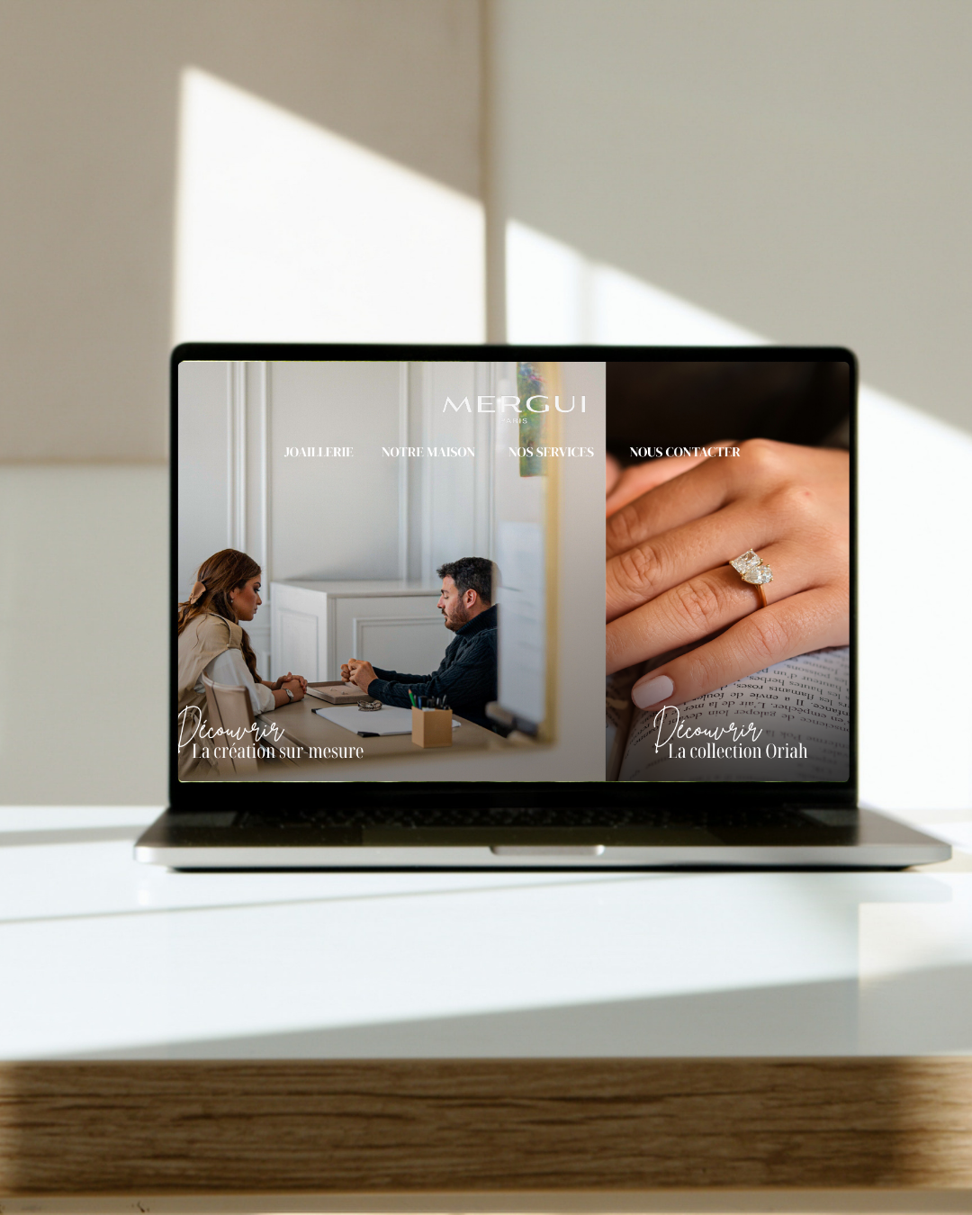 Nous avons également accompagné la Maison MERGUI Paris dans la refonte de son site internet, pensée comme une véritable vitrine digitale, fidèle à l’univers et au positionnement de la Maison.